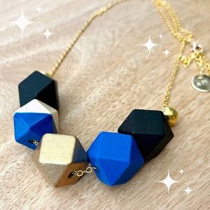 Glam up your next holiday party with this fun necklace! Set on a 20” gold chain and made with hand painted geometric hedron beads and gold spacers, this style is sure to sparkle this season.