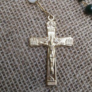 Handmade rosary with goldtone crucifix. The decades are made with 8 mm dark green aqua aura resin beads, and the "Our Fathers" are 8 mm white aqua aura resin beads. Wire and chain used are goldtone. The centerpiece is gold pewter Mary, made in Italy. Crucifix is gold pewter. Centerpiece is 3/4 inch high. Cross is 2 inches high. For women or men. Great for anyone who likes artistic rosaries. New item from my local shop.