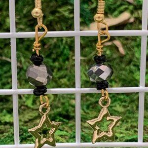 This matching set of earrings have two black seed beads and one shiny gray bead in the middle with a gold star at the end. Super cute for any formal events or even just hanging out!