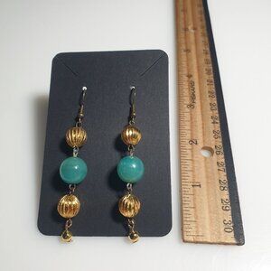 Elegant dangle earrings with gold-tone textured beads and aqua round beads. Features fish hook backs with soft stoppers for secure wear. Lightweight and versatile accessory.