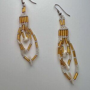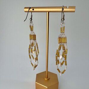 Handmade Gold & White Beaded Dangle Earrings Pierced Ears