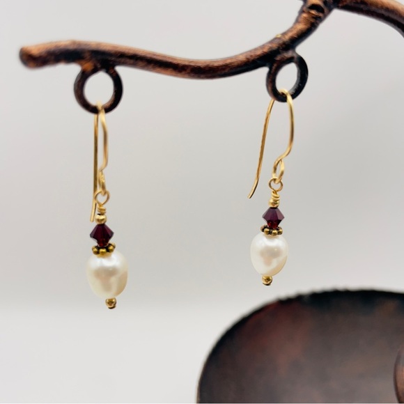 Elegant and timeless, these handmade drop earrings feature a beautiful combination of deep red garnet crystals and lustrous freshwater pearls, finished with gold-tone accents and classic French wire hooks. The mix of natural pearls with faceted garnet gives them a sophisticated yet versatile look — perfect for both everyday wear and special occasions.