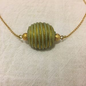 Handmade gold/light green necklace made by me. Chain is 20 inches long and has a lobster clasp. Center bead is a very unique fabric wrapped bead with two sparkly gold beads on each side.