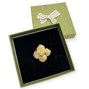 Elegant gold-tone flower brooch featuring textured petals and a sparkling clear rhinestone at the center. Compact and chic, it's the perfect accent for blazers, scarves, or formalwear.