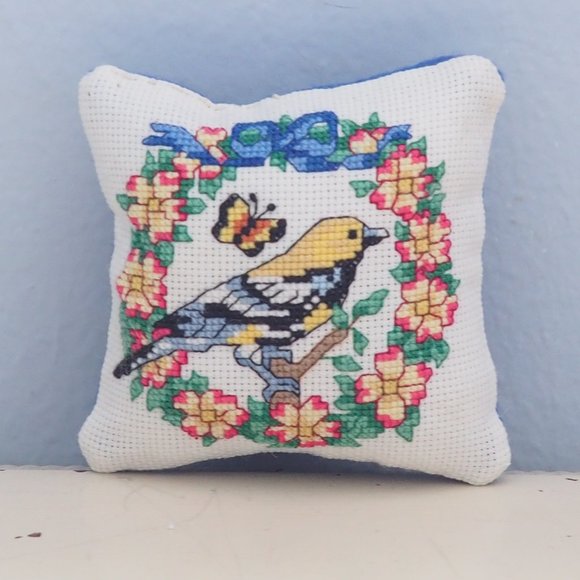 This little pincushion is handmade and features a goldfinch and butterfly wreathed in flowers. The colors are all a bit darker/richer in person, especially the blue felt backing. It's the perfect gift for crafters and birders alike.