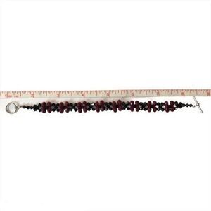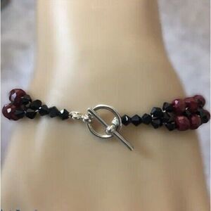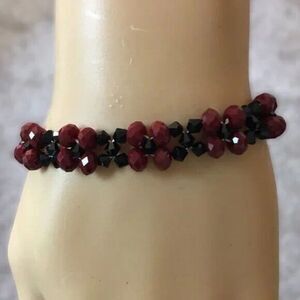 A hand assembled red & black faceted glass bead bracelet with a silver-colored bar & loop toggle closure. Measures about 7.5 inches long. In good condition. Light wear throughout. Unsigned, handmade costume jewelry.