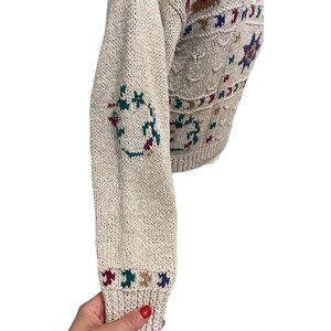 This cozy hand knit sweater features an intricate pattern of colorful motifs, including a house, stars, and whimsical florals. The chunky knit and unique patterns give it a distinct "cabin core," "grandma core," or "cottage core" aesthetic.