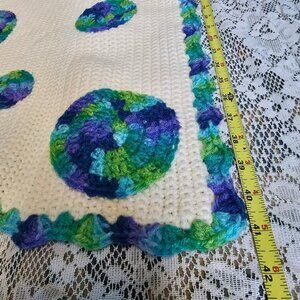 Offered here is a Small Handmade Crochet Granny Square Rounds Circles Afghan - Baby Size / Lap Blanket Throw - Approximately 32x42" - Cream White Blanket with Blue / Green / Purple Circles and Border