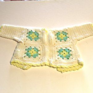 This is a one-of-a-kind, handmade crochet layette set consisting of booties, sweater and hat.