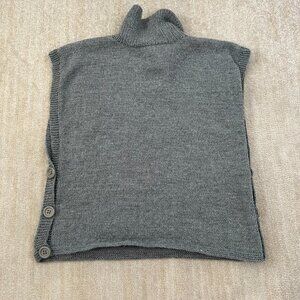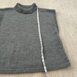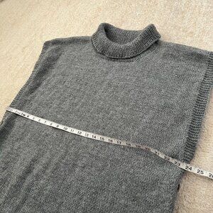 A gray turtleneck sleeveless sweater. Handmade: no brand, size, or care tags. Fabric content unknown, feels soft and warm. Deep / low armhole and buttoned sides. Measures like it could fit up to a L.