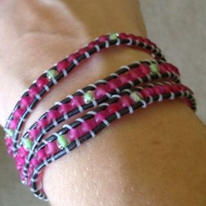 This bracelet is made if gray leather with pink and green beads and a sliver button closure. It's made to wrap around 3 times and is 21.5" long.