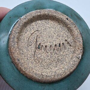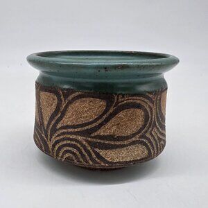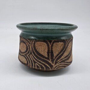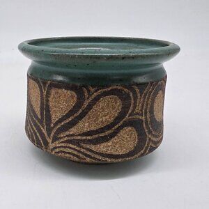 Handmade Green & Brown Ceramic Vase Pot With Textured Floral Design Signed