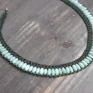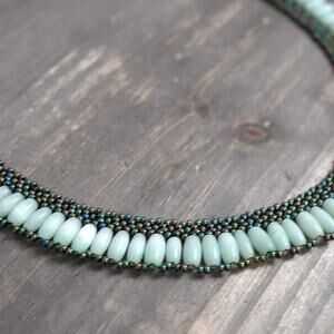 Handmade beaded necklace featuring green cat's eye quartz and iridescent glass beads