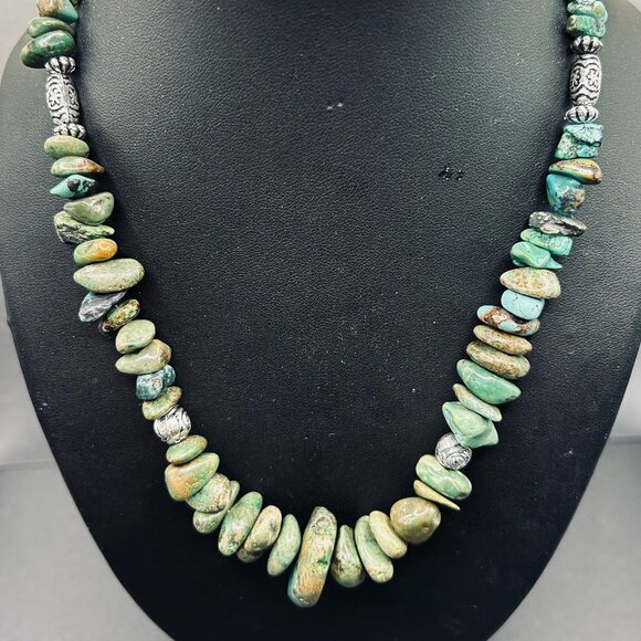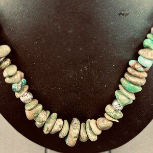 Handmade blue and green jasper 16" necklace. The stones in this necklace are a variety of colors with sizes ranging from larger to small chips mixed with silver accents.