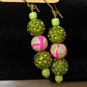 Fun and vibrant, these handmade earrings feature a bold mix of sparkling green rhinestone-style beads, solid green accent beads, and pink floral-patterned round beads for a playful contrast. Lightweight and eye-catching, these dangles are perfect for adding a pop of color to any outfit.