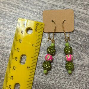 Handmade Green & Pink Beaded Dangle Earrings Sparkle & Floral Statement Jewelry