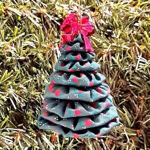 Add a touch of handmade charm to your holiday décor with this sweet fabric Christmas tree ornament! Made with tiered green fabric featuring red accents, this “yo-yo scrunchie” style tree is topped with a shiny red bow and gold hanging loop. Perfect for cottagecore, country, or vintage-inspired Christmas themes.