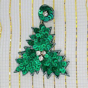 Elevate your holiday fashion with these exquisitely designed festive tree leaf sequin earrings. Adorned with intricate hand-beaded details, their lightweight nature makes them an ideal complement to special occasion attire. Embrace the spirit of the season and achieve a distinct, unique look with these refined earrings.