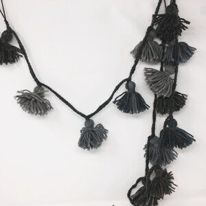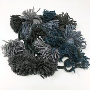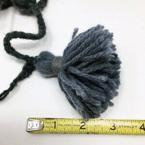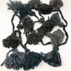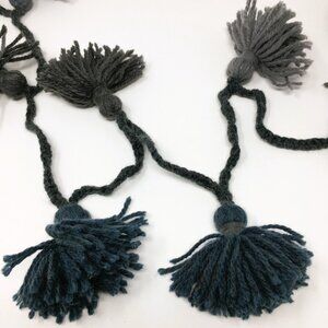 - 7' long garland made of 14 grey, steel, and blue wool/acrylic blend tassels on a braided lucet cord