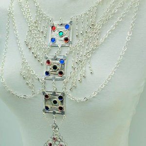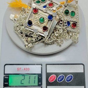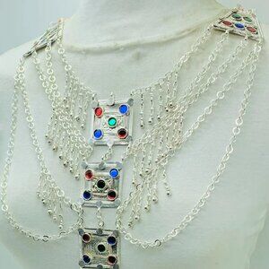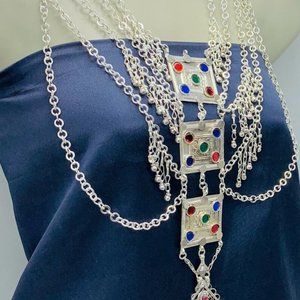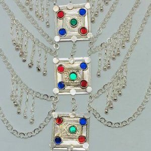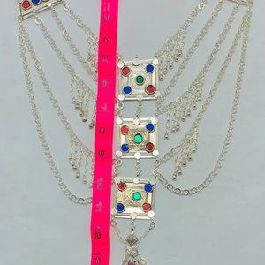 • Multiple silver chains are beautified on this necklace with multi-hued glass stones. Silver dangling rhythmic bells give the full tribal touch to this piece. This Afghan necklace is the best choice for the dancers and there is no need to wear an Afghan belt. This massive tribal necklace is made up of the best choice of material.