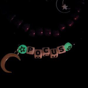 Set of 3 Hocus Pocus stackable charm bracelets! These bracelets are great for Halloween or any occasion. They are made with pony beads, white letter beads, glow in the dark moon and star beads, silver charms, jump rings, and elastic string to adjust to most wrists. Great for kids, teenagers, adults and anyone in between!