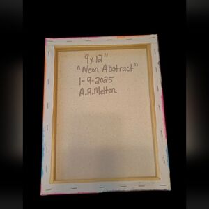 Vibrant abstract geometric canvas art. Features bold pink, orange, and blue shapes with black accents. Handpainted by me with neon acrylic paint.