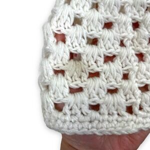 Beautiful hand knit child's white beanie featuring a 3 dimensional pink rose with green leaves. Perfect baby shower gift!