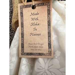 This is a handmade Hawaiian hula doll featuring a traditional hula outfit with a floral headpiece. The doll is crafted with fabric and straw materials, and includes a tag indicating it was made in Hawaii with aloha.