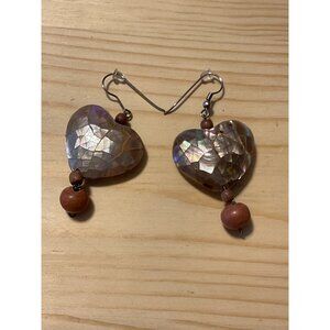 Elevate your style with these unique handmade earrings. The iridescent shell hearts and wooden beads create a stunning blend of natural beauty and elegance.