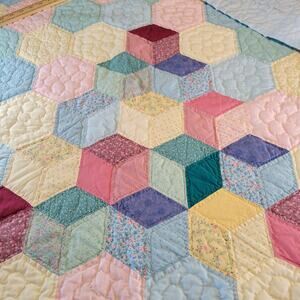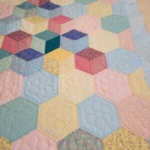 Vintage handmade quilt from 1990 featuring pastel hexagon patchwork with detailed hand quilting. Measures 51x39 inches, perfect as a baby quilt, lap throw, or decor accent. Beautiful soft tones with geometric design.