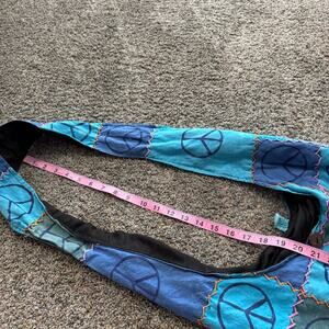 Handmade in Nepal Boho Funky Hippie Crossbody Shoulder Bag Purse Blue Peace Signs. Button and loop and zipper closure for security. Bag has been cold water washed and air dried and is ready to use again; bag is in good used condition with some small signs of wear and a few black ink spot stains here and there. Please see close-up pictures for condition details and measurements.