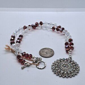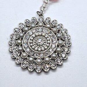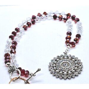 This handmade necklace is perfect for the holiday season. The pendant is round and features clear rhinestones. The necklace is made with a toggle closure and a wire chain. It is perfect for any occasion or as a gift for a loved one.
