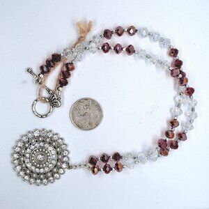 The necklace is crafted by an artisan and has a vintage look. It is a pendant style that is beaded with crystal stones. The necklace is made with recycled materials, making it an eco-friendly choice. The brand is known for its high-quality handcrafted glass and stone.