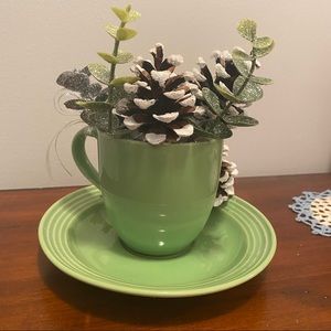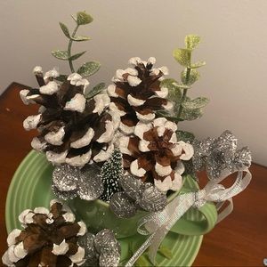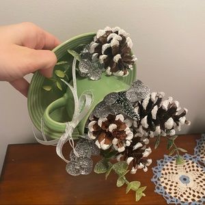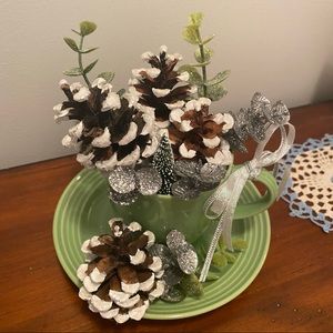 Handcrafted by me - this holiday decoration features an arrangement of pinecones in a retro apple green teacup and saucer! All pinecones were found in nature by me. Each pinecone is hand painted, hand glittered and sealed. Alongside the pinecones are faux green and silver eucalyptus leaves, a tiny Christmas tree, and a pretty bow tied onto the teacup’s handle. Every piece in this arrangement is securely glued into place.