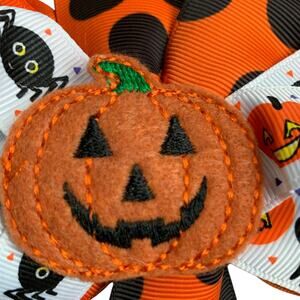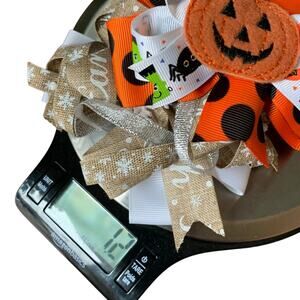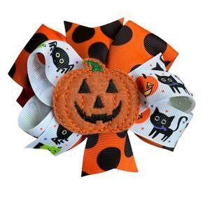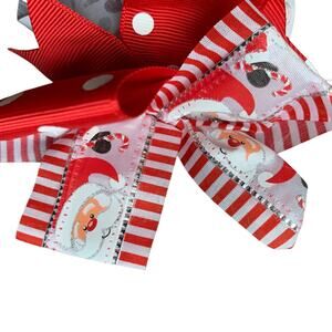 Three holiday bows: one Halloween pumpkin and two Christmas, one featuring Santa Claus and one with snowflakes and peace on earth