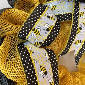 This Bumble Bee Burlap Wreath will add a unique touch to your wall decor. This wreath is perfect for anyone who loves bumble bee/honey bee decor. The base of the wreath is a yellow poly burlap framed with a black poly burlap. The buzzing bee wired ribbon has a black polka dot border that adds to the charm of this wreath. The finishing touch is the large black bow with a smaller bumble bee bow and long flowing bumble bee ribbon tails.