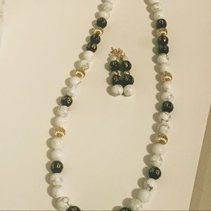 22" 10mm Howlite with craved black agate beads. This set is made with 14kt gold filled clasp, beads, and earring post.