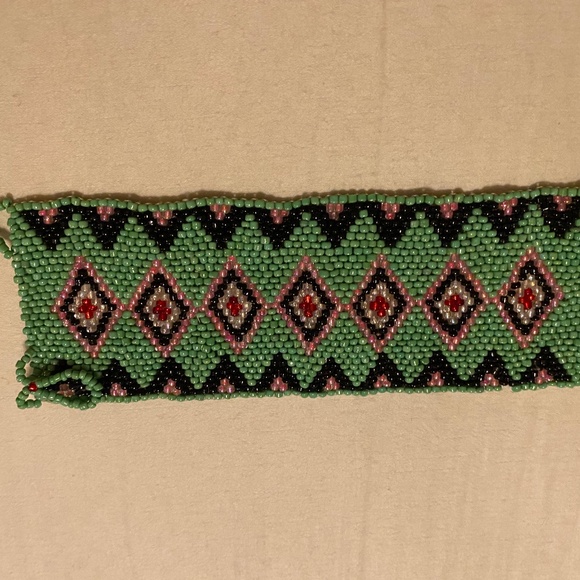 Handmade Huichol-style wide band seed bead bracelet featuring a green, black, pink, red diamond geometric pattern.