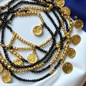 ๐ Handmade Indian Artisan Gold & Black Coin Charm 8-Piece Beaded Bracelet Set