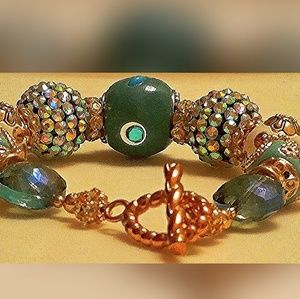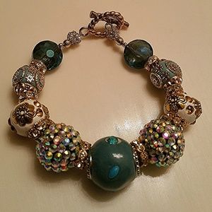 Bracelet features light blue and white Indonesian beads alternated with AB finish. Bracelet has dark blue crystals for accent. Bracelet is finished off with antique gold finished toggle clasp. Measures approximately 8 inches in length. Enjoy 🌷