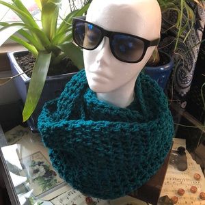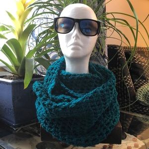 Stay warm with this cozy and chunky handmade scarf. This scarf was crocheted by me! Made from new materials and never worn. Comes from a clean and smoke free home. Scarf is meant to loop around your neck twice and is about 50 inches in diameter and 12 inches wide. Yarn is super soft and a beautiful turquoise color.