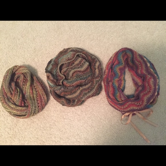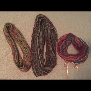 My Nana made these scarves and is moving to Florida so she gave me all her handmade items. It's a bundle of 3 scarves of various colors. They are all infinity scarves and have never been worn and have no holes or stains. Thanks!