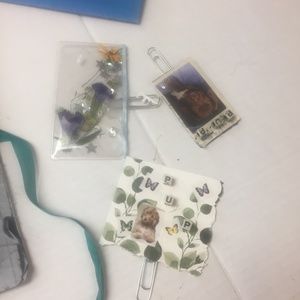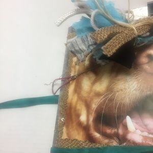Handmade Junk Journal-Dog/Puppy theme.-Overstuffed chunky handmade journal with 5 signatures made out of cereal boxes w various papers, bags, envelopes, pockets, embellished paper clips, embellished safety pins, many pages decorated, lots of room to write and add your own decoration. Book Size: 7 x 10 inches. Includes handmade tassel, bookmark and turquoise seam binding ribbon to tie together.Includes dog/puppy greeting cards. If you want to see more pictures, let me know.