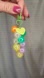 Multi-color (green, yellow, white, orange, and lavender bead "grapes" style dangling bag charm with green metal heart and round bell at the top of the cluster, with a green clip.