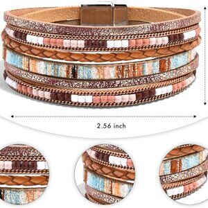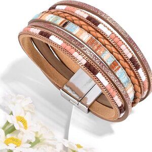 Features: Eco-friendly, lightweight, multi-layer leather design with brass pipes and beads creates a trendy, personalized look. Comfortable to wear all day, sturdy clasp for easy on/off. Makes a chic statement whether dressed up or down.