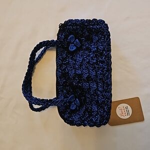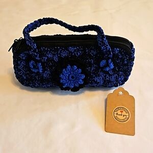 Add some fun and color to your kid’s look with this hand-knit crochet mini bag! Made with soft, 100% acrylic yarn in black and blue, this pouch is both durable and lightweight. It features a cute 2" x 2" flower detail in the center and four little flower buds on the handle perfect for kids who love fun, colorful accessories