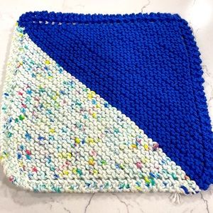 Handmade Cloth Hotplate. Not to thick and not too thin. Cannot commit to exact temperature withstanding but it’s a beautiful handmade piece that would make granny proud. Two toned blue. Majority color is a rich cobalt blue.