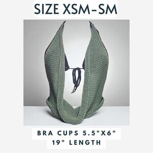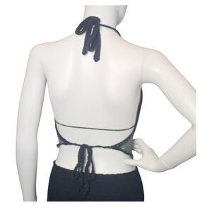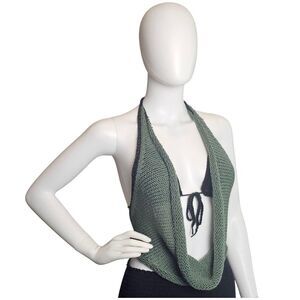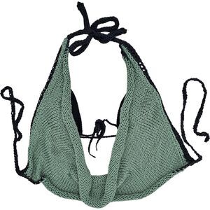 This one-of-a-kind handmade piece features a sage green knit draped halter layered over a black crochet triangle bra. The deep cowl neckline and open back design give it that effortless, flirty vibe — perfect for festivals, beach days, or layering for a bold streetwear look.