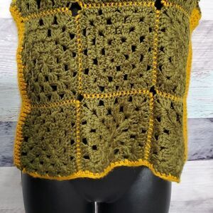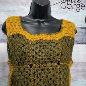 Handmade Knitted Crochet Olive Green Mustard Yellow Sleeveless Vest Shell Blouse