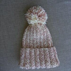 Handmade Knitted Ribbed Beanie With Pompom Soft Pink and White Warm Hat Cap